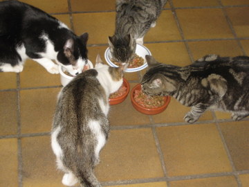 Vanuit menselijk perspectief kan samen eten gezellig zijn, leuk met vrienden bij elkaar. Maar geldt dit ook voor de kat? Een kat jaagt van nature alleen en eet ook alleen zijn prooi op, afgezien van moederpoes die haar kittens leert jagen en voer brengt. Katten die een sociale groep vormen, kunnen in elkaars nabijheid eten, wel graag ieder uit een eigen bakje. Maar katten die samen in een huis leven en geen sociale groep vormen, hebben ieder hun eigen ruimte nodig om stressvrij te kunnen eten. Het kan zijn dat de bakjes uit elkaar geplaatst moeten worden, het kan ook zijn dat sommige katten in een andere ruimte of op hoogte willen eten om geen stress te ervaren. De normale lichaamshouding van een kat tijdens het eten, is met de buik op de grond, liggend dus, of zittend, maar zeker niet staand met gespitste oren, zwiepende staart, rondkijkend.