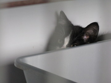 Deze kat bleek zo angstig te zijn, dat hij zich, ook als er niemand in de buurt was, niet kon ontspannen. Op camerabeelden was te zien dat hij continu achter in zijn hok bleef zitten met vergrote pupillen. Op het moment dat de deur openging, zag je hem in elkaar duiken en hoorde je hem zachtjes grommen. Het had wel iets geholpen om in elk geval een doek voor zijn hok te hangen, maar deze arme kat zat letterlijk verstijfd van angst en in chronische stress in zijn hok.